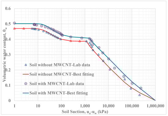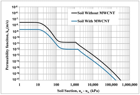 As seen in the graph, the result shows that the unsaturated permeability of soil with carbon nanotubes was lower. The saturated permeability of soil without MWCNTs was 3 × 10−8 m/s, while the saturated permeability of soil with carbon nanotubes was 2 × 10−9 m/s. The reduction in soil permeability could be attributed to the fact that carbon nanotubes have the potential to affect soil pores and connectivity. Since the CNT has very small particles, it can fill the soil’s voids and decrease the water flow into the soil.