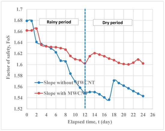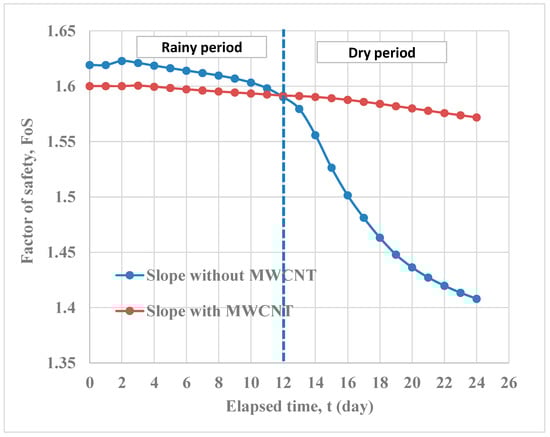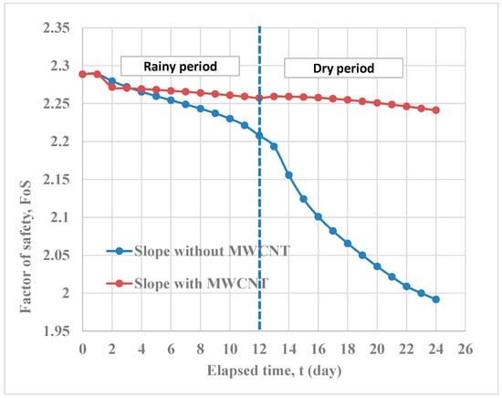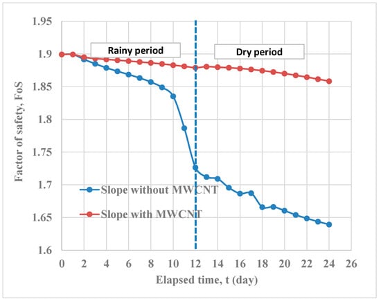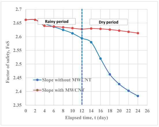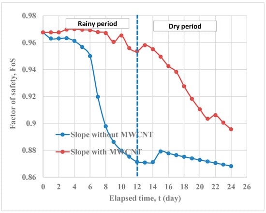 As the slope inclination increased, the factor of safety decreased in both slopes with and without MWCNTs. However, the slopes behaved the same; at the beginning, the slope safety factor was the same for both slopes, and then, it decreased, with a higher rate in the slope without MWCNTs. As shown in Figure 9, the FoS in the slope with 10 m height and 35° inclination was 2.28 at the beginning for both the scenarios with and without MWCNTs. Comparing the result with the slope of 10 m height and 27° angle, it significantly decreased. The factor of safety for the raining period for the bare slope decreased to 2.21 and for the MWCNT-stabilized slope decreased to 2.26. Again, the decreasing rate for the slope without carbon nanotubes was more than two times higher. The factor of safety at the end of the drying period after 24 days decreased significantly for the soil without carbon nanotubes, while it only slightly changed for the MWCNT-stabilized slope.