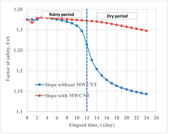 - The result from the numerical analysis indicates that the application of carbon nanotubes helps maintain the stability of the slope under rainfall conditions. A comparison between the slopes with and without carbon nanotubes for all slope angles and heights demonstrated that the slope factor of safety at the beginning of the raining period was the same for both the MWCNT-stabilized slope and the slope without carbon nanotubes. The result for the first period shows that the FoS decreased because of the water infiltration. However, after the rainfall, the FoS of the slope without carbon nanotubes decreased dramatically, while the FoS of the MWCNT-stabilized slope only changed slightly;