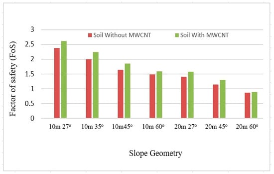 - The result from the numerical analysis shows that the factor of safety of the slope decreased with the increment in the slope’s inclination and height. The FoS of the slope with the 27° inclination and 10 m height at the beginning of the raining period (t = 0) was 2.66 for the slopes both with and without carbon nanotubes. At the end of the raining period, the safety factor of the slope without MWCNTs decreased to 2.39, and the FoS of the slope with MWCNTs changed only slightly to 2.63. As the slope inclination increased to 35°, 45°, and 60°, the factor of safety decreased to 2.28, 1.9, and 1.84, respectively. Similarly, as the height of the slope increased to 20 m, the FoS of the slope decreased to 1.62, 1.34, and 0.98 for the inclinations of 27°, 35°, and 45°;