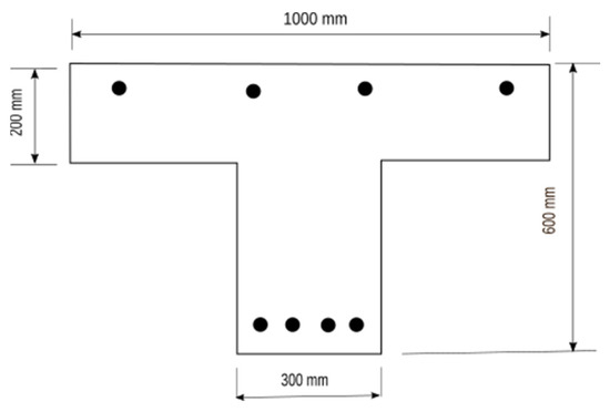 The system selected for analysis is a two-span undivided RC bridge with no bridge barrier between the marked lanes. The bridge is symmetrical about the middle support. The span length is shown in Figure 1, and the cross-section of an interior girder is shown in Figure 2. The material strengths used are as follows: the concrete characteristic strength f′c = 40 N/mm2, the yield strength is 500 MPa for both longitudinal and shear reinforcements, and the modulus of elasticity Es for the reinforcements is 200.0 × 103 MPa. The shear reinforcement is two legs of N16 (Asv = 400 mm2) at 200 mm centers along the girder. The top longitudinal reinforcement is assumed to be 4N24 (Ast = 1800 mm2) and the bottom reinforcement is 4N20 (Ast = 1240 mm2). The sections are assumed to be singly reinforced for bending, with the area of steel Ast equaling that of the bottom steel for T-beam positive bending and equaling that of the top steel for rectangular beam negative bending. Effective depths for both top and bottom steels are assumed to be the same, equal to 500 mm.