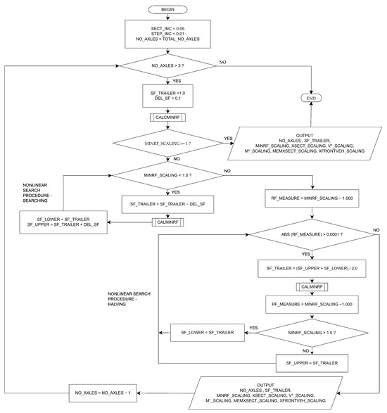 The second stage “halving” is used to progressively reduce the bounding limits by replacing one of the two limits by the halfway value SFtrailer (=[SFupper + SFlower]/2) that maintains the bound. The narrowing of the bound continues until the halfway value gives an RF close to unity within a prescribed tolerance. A tight tolerance requirement of RF to be within 1.0 × 10−4 was used. The seeking of the SFtrailer for optimal shear adequacy was carried out for a range of vehicles with different numbers of trailer axles. The analysis begins with seeking the SFtrailer for a vehicle with 12 trailer axles (representing a G2V5) and progressively reducing the number of axles; the seeking of SFtrailer is carried out for each vehicle with the reduced number of axles until a vehicle without scaling is not restricted, that is, when the minimum RF ≥ 1 for SFtrailer = 1. Figure 4 shows the flow diagram describing the main program.