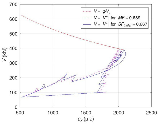 Figure 5 shows the shear plotted against the longitudinal concrete strain εx at the mid-depth of member 1 at xsect = 11.5 m for the 11-axle vehicle. This is the system with the largest error in Table 3. Figure 5 shows the results of the two vehicles, one with a reduction factor of 0.667 applied to trailer axles (which is the SFtrailer), and the other with 0.689 applied to all axles (which is the MF). While both meet the strength line without exceeding it, as expected, they meet the strength line at different points, the former at ϕVu = 389 kN and the latter at ϕVu = 396 kN. The load effect for SFtrailer is accurate since the scaling of the axle loads is for the trailer only; the load effect from using the MF is not accurate. The plots show the unsuitability of using the MF to determine the allowable cartages of vehicle–bridge systems where the critical loading point has one or more PM axles on the bridge.