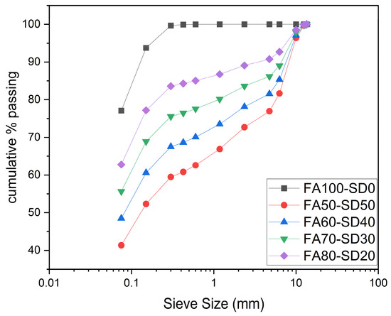 Stone crusher dust and crushed stone aggregates (combined and designated as SD) were procured from the stone crusher at Tapang of Khurdha District in Odisha state. The maximum particle size of the stone dust and aggregate was 4.75 mm and 12.5 mm respectively. The SD was mixed with fly ash in different proportions to improve the gradation, as shown in Figure 2.