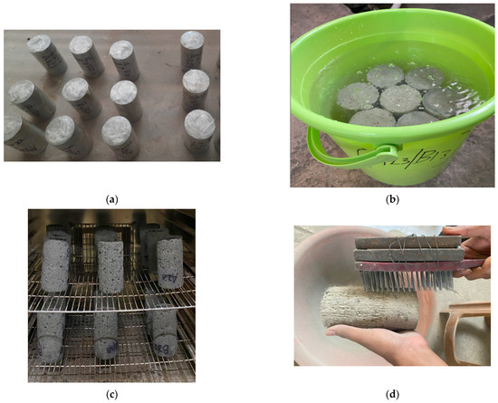 Steps of wet–dry durability test. (a) Cylindrical samples after 7 days of curing; (b) samples immersed in water for 5 h; (c) samples in oven at 72 °C for 42 h; (d) samples under hand brushing.