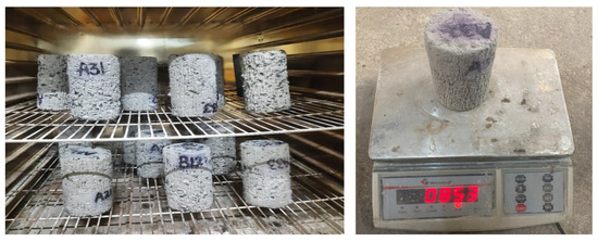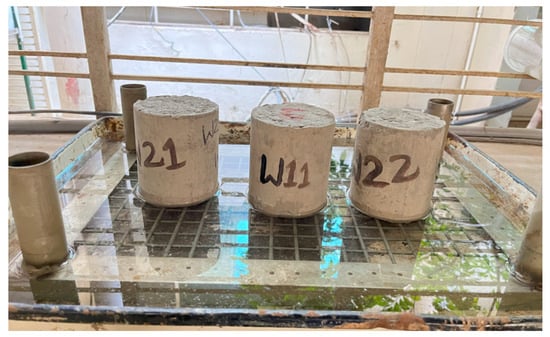 The capillary rise and water absorption test were conducted following the Australian standard AS 1141.53 [27], as illustrated in Figure 4. In this study, cylindrical specimens (100 mm in dia. and 115 mm in height) cured for 7 days were used. After achieving a constant mass (mdry) in an oven at 55 °C, the dried samples were placed in a dish filled with water reaching up to 10 mm from the base to simulate capillary rise. The ascent of water was measured at various time intervals, as depicted in Figure 5, showcasing specimens undergoing the water absorption and capillary rise test. After 72 h, the specimens were extracted from the dish. The mass of the dampened specimens (mdamp) was then recorded. These specimens were subsequently placed in an oven at 105 °C. The process continued until a constant mass (md) was achieved. Capillary rise (CR) was calculated as the height of capillary rise expressed as a percentage of the total height of specimens. Additionally, the calculation involves considering the total water absorption given by Equation (3).