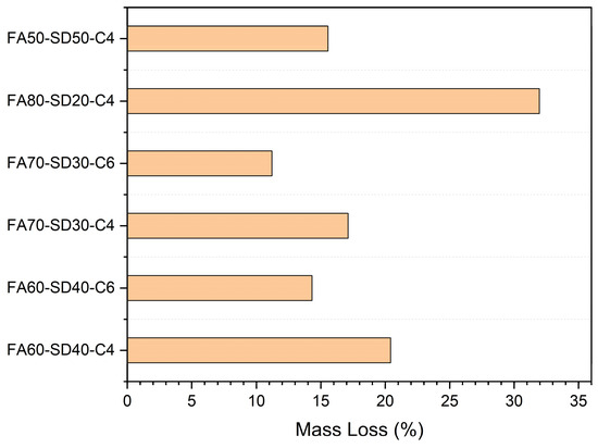3.1.1. Effect of Cement Content on Mass Loss of FA–SD Mixes