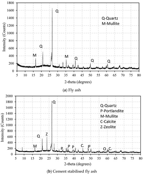 The XRD test results of fly ash and cement-treated fly ash, as depicted in Figure 8a,b, reveal quartz as the predominant compound in all cases. Simultaneously, the appearance of new peaks in the cement–fly ash mixture indicates the presence of cementitious products like portlandite, calcite, and zeolite. These compounds are formed due to the addition of cement.