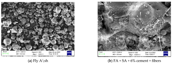 SEM photographs. (a) Fly ash; (b) fly ash + cement + fibers.