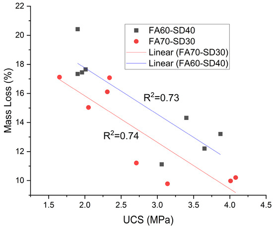 Correlation between mass loss (%) and unsoaked UCS of FA–SD samples at 7 days of curing.