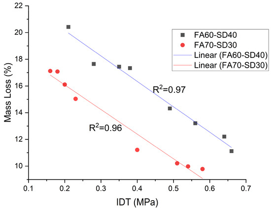 A good correlation between mass loss and IDT of FA–SD samples is shown in Figure 12. A negative linear relationship between IDT and mass loss was also observed for the FA60-SD40 and FA70-SD30 mixtures. However, the correlation coefficient R2 for both UCS and mass loss is found to be between 0.64 and 0.74 and that for IDT and mass loss is found to be between 0.9 and 0.96. This indicates that IDT can be used as a better indicator for the determination of mass loss. The durability of FA–SD samples in terms of mass loss can be better determined by correlating with IDT compared to UCS value.