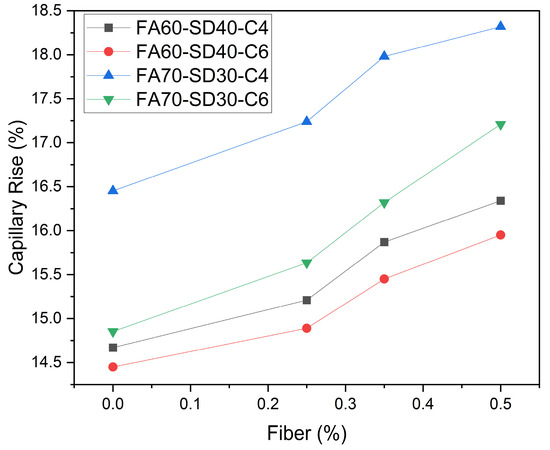 Figure 14 illustrates the influence of fibers on the capillary rise of cement-stabilized FA-SD samples reinforced with PP fibers at contents ranging from 0.25% to 0.5%. The data in Figure 14 indicate a rise in capillary action with an increase in fiber content for all mixtures. The increase in capillary rise ranged from 1.67% to 2.36% for 0.25% to 0.5% fibers compared to 0% fibers. This may be due to the action of fibers as capillary tubes, which accelerate capillary action in the samples.
