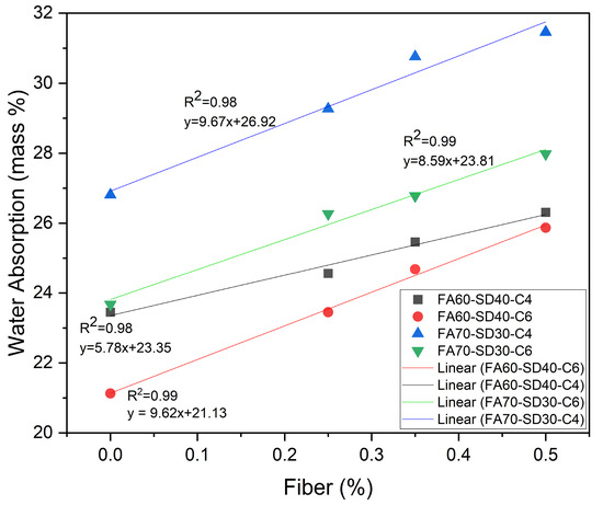 Correlation between fiber percentages and water absorption for FA–SD mixes.