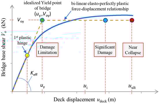 - A suitable numerical nonlinear model of the RC bridge is established, and a sequence of separate pushover analyses are performed along the longitudinal direction, targeting each time at a gradual increasing deck displacement . For each target displacement, one pushover analysis is performed leading to the drawing of the capacity curve of the bridge in terms of base shear and deck displacement . The base shear of the bridge is computed as the sum of the base shears of the various bridge piers, where each pier can consist of several columns. Figure 1 illustrates the general form of the capacity curve of the bridge along the longitudinal direction. Additionally, the figure features an idealized elasto-perfectly plastic force–displacement relationship, defining the idealized yield point () of the bridge and the effective (secant) stiffness at the yield point. Various performance levels of the bridge corresponding to different deck displacements are presented in the figure. The Near Collapse state of the bridge is characterized by the ultimate target (deck) displacement, . It is noted that P-D effects should always be considered in pushover analysis, especially for more flexible bridge structures. However, caution is advised, as spurious results may arise from the above consideration in the instantaneous modal analyses that follow. This potential issue can be caused from the possible appearance of negative stiffness in the capacity curve due to the P-D effects. Regarding the effective stiffness of the RC bridge piers in the pushover analysis, a proposed stiffness scenario is outlined in the subsequent step.