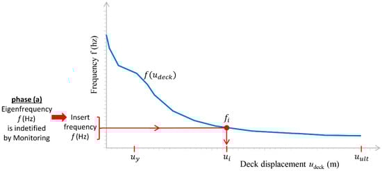- The known eigenfrequency (in Hz) of the existing bridge, obtained through the monitoring procedure in phase (a), is incorporated into the instantaneous eigenfrequency diagram (Figure 2). Consequently, the corresponding inelastic seismic (target) deck displacement of the bridge is determined from the diagram.