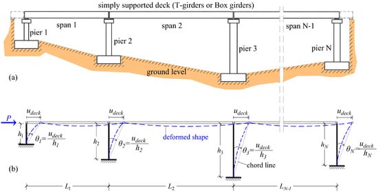 (a) Simply supported straight bridge with N-1 spans of various lengths and N-piers of various heights; (b) chord rotation of the bridge piers in pushover analysis with lateral force at the deck level.