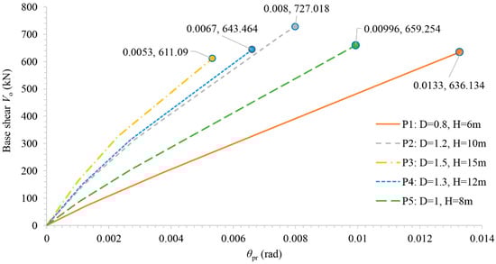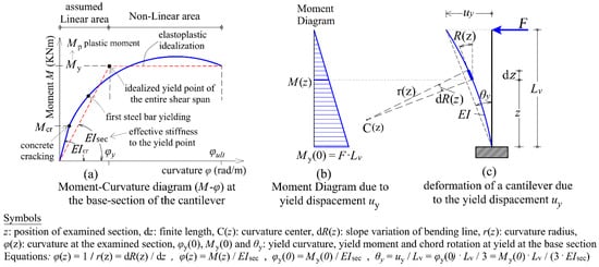 where is the plastic moment of the base-section of the piers, which is calculated through a section analysis using an elastoplastic idealization of the moment–curvature diagram Μ-φ; signifies the shear span of the piers, which is equal to the height of the piers from the foundation level to the bottom of the deck girders. Additionally, denotes the chord rotation of the shear span of the piers at the yield state, approximately given by Equation (A.10) of Eurocode EN 1998-3 [].