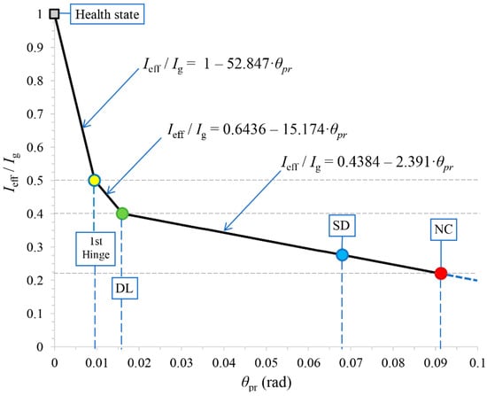 It was found that the mean values of between all examined RC piers (with different circular sections) at the 1st yield, DL, SD, and NC states were approximately equal to 0.0095, 0.016, 0.068, and 0.091 rad, respectively. The corresponding mean values of were approximately equal to 0.5. 0.4, 0.28, and 0.22. Furthermore, the effective stiffness scenario depicted in Figure 5 introduces discrete values starting from the uncracked (health) state towards the 1st hinge (indicating the 1st yield), and then progressing to DL. At the 1st hinge, the value is considered, as suggested in EN 1998-1 [] for elastic analysis. Additionally, three straight lines for the effective stiffness ratio of the piers within the linear and nonlinear areas are presented in Figure 5. These lines align with the abovementioned proposed and values for the 1st yield, DL, SD, and NC states:
