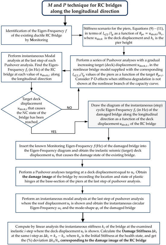 In Figure 6, a flowchart illustrating the application of the “M and P” technique for the identification of damage in RC bridges is presented.