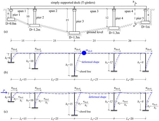 (a) Straight RC bridge with four spans and with (2 column) piers of various heights; (b) dynamic model of RC bridge (SDOF) for modal analysis; (c) static model of RC bridge for pushover analysis.