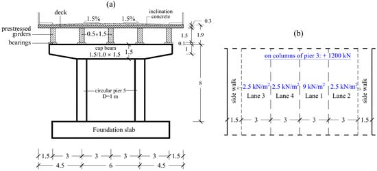 (a) Section aa at pier 5 of the RC bridge; (b) lane set-up and live loads on lanes.