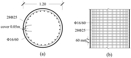 All circular column sections are symmetrically reinforced, with geometrical ratios ranging from 1% to 3% for the longitudinal reinforcement. The columns of the shortest pier 1 are the most reinforced. Confinement reinforcement in all columns consists of closed circular hoops with a diameter of 16 mm, evenly spaced at critical end sections with an axial spacing of 5 or 6 cm. The concrete cover is 5 cm. The steel reinforcement details of a typical circular column section are depicted in Figure 9. The longitudinal and shear reinforcements of the circular columns are outlined in Table 1. Τhe reinforcement details of the beam caps and the deck are omitted here as they are not relevant. The seismic behavior of the RC bridge relies exclusively on the behavior of the piers acting as cantilevers with a common top displacement, ensured by the rigid deck system. It is noteworthy that the RC bridge has been designed in accordance with EN 1998-1 [] and EN 1998-2 [] for the high ductility class (DCH). Consequently, it is expected to exhibit highly ductile behavior in the nonlinear domain, developing plastic hinges at the base of the columns.
