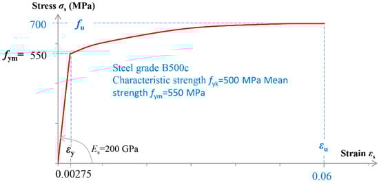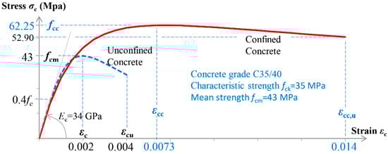 Next, a series of pushover and instantaneous modal analyses is conducted to implement the “M and P” technique for structural damage identification in the existing RC bridge. The FEM analysis software SAP2000 [] is utilized for this purpose. Plastic hinges of the fiber type are incorporated at the base of the piers in the nonlinear model of the bridge to simulate potential locations of inelastic behavior. The constitutive relationships used to characterize the behavior of construction materials in both the linear and nonlinear domains are as follows: (a) the model proposed by Mander, Priestley, and Park (1988) [] for uniaxial unconfined and confined concrete (Figure 10); and (b) the model proposed by Park and Paulay (1975) [] for steel reinforcement, which is parabolic in the strain hardening region (Figure 11). All necessary data for the nonlinear simulation of the bridge are derived from the results of a section analysis. The data for the base section of the piers are presented in Table 2, where the effective stiffness ratio is calculated using Equation (7) in accordance with EN 1998-3 []. The plastic hinge length of the fiber hinges is calculated using Equation (8) and is shown in the last column of Table 2.