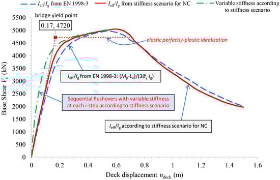 Capacity curve of the RC bridge along the longitudinal direction according to various stiffness scenarios. Ref. [].