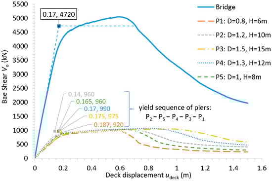 Additionally, Figure 12 includes the capacity curve of the bridge obtained from a pushover analysis using the stiffness scenario proposed in EN 1998-3 [] (Equation (7)). Furthermore, Figure 12 displays the capacity curve of the bridge derived from sequential pushover analyses, targeting each time an increasing deck displacement from the health state to NC state, using the stiffness scenario proposed in Figure 5 for the discrete values of the target deck displacement. As observed in Figure 12, the influence of the effective stiffness scenario on the results of pushover analysis is more pronounced for higher performance levels due to the delayed onset of the yield state of the bridge. In Figure 13, the capacity curve of the bridge is presented again for the case of the proposed stiffness scenario at the NC state, along with the capacity curves of the various piers (each having two columns). The contribution of the various piers to the capacity of the bridge, in terms of base shear and deck displacement, is evident in the figure. The yield points of the piers, derived from the bilinear idealization of their curves, are also displayed in Figure 13, illustrating the yield sequence. The NC state of the bridge is induced by the failure of the shortest columns of pier 1, which develop a chord rotation at their base sections equal to rad. At the failure of the columns of pier 1, the columns of the other piers develop the following chord rotations at their base sections: , , , and in rad units. It is noted that for lower values of the target deck displacement driving the RC bridge to higher performance levels (for example, DL or SD), the corresponding values of from Table 3 should be assigned to the piers. Therefore, the capacity curve resulting from the pushover analysis of the bridge targeting a higher performance level will not exhibit exactly the same characteristics as that for the NC state (see Figure 14).
