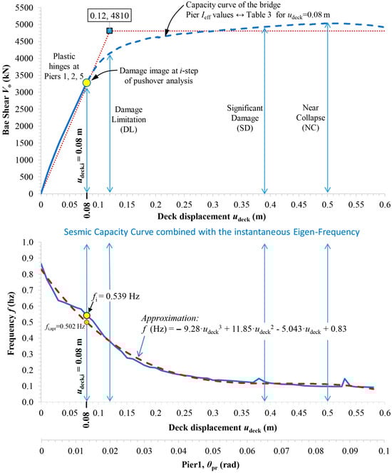 Subsequently, a series of instantaneous modal analyses along the longitudinal direction of the RC bridge is performed following the final step of each one of the separate pushover analyses in the series. These modal analyses have as initial condition the damage state of the bridge at the final step of the separate pushover analyses with target deck displacement . In other words, the stiffness of the damaged bridge at the final step of each pushover analysis is used. From this series of modal analyses on the RC bridge, the instantaneous cyclic eigenfrequency (in Hz) of the SDOF system along the longitudinal direction is recorded at each i-step. This information is then utilized to generate the diagram of the instantaneous cyclic eigenfrequency (in Hz) of the RC bridge across the linear and nonlinear domains as a function of the deck displacement, . Figure 14 depicts this diagram along with an approximate line that encompasses all performance levels.