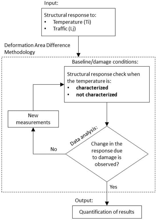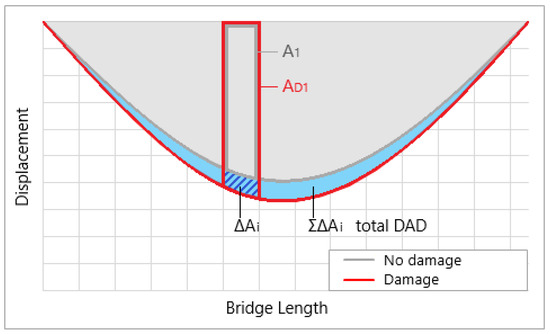 The Deformation Area Difference (DAD) Method proposed by Erdenebat et al. [33] can be considered for condition assessment (Figure 2). For long-term bridge condition assessments from inspections, this method can also be used for damage localization. The premise is that baseline structural responses (e.g., vertical deflection) are compared to the newly measured responses. The difference between deflections is presented as deformation area(s). Although the method has been proven to work, the accuracy of its results and their precise interpretation are directly affected by the number of measurement points on the structure [34]. DAD can be determined using Equation (1), which involves squaring the differences in the area between the deflection line curves generated by the analyzed structure state and the corresponding reference system in the absence of damage. In this equation, represents the deflection function of the damaged curve, and represents the deflection function of the reference curve. The variable refers to the specific area section, such as , , and so on. denotes the area difference in section , while represents the total area difference in the entire structure [33].