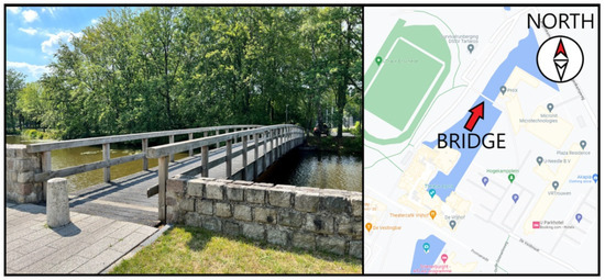 In this study, the UT Campus bridge (Figure 3) is selected. The bridge serves as a crossing for pedestrians and cyclists over a pond. It is a steel girder bridge located at the University of Twente campus in the Netherlands. The bridge was possibly commenced to the public in the 1980s as a pedestrian footbridge. Spanning 27 m, it connects the Hogekamp (sast) and the sports stadium (west) across a pond. The bridge has some signs of corrosion. The bridge is positioned in the northwest direction. Due to a nearby tall building and trees, only the southwest side of the bridge is directly exposed to the sun, especially during spring and autumn months, resulting in differential thermal expansion/contraction of the structure. The north side of the bridge is mostly hidden from the sun.