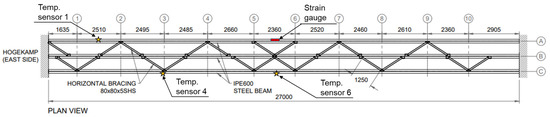 A sketch of the bridge with its main dimensions and selected sensors from its SHM network is shown in Figure 4. The bridge consists of three 27 m long IPE600 steel girders and 80 × 80 × 5SHS horizontal bracings. D40 hardwood oak timber decking and poles with handrails cover the structure. The girders of the bridge are named according to the axes on which they lay. For example, the middle girder, which is on axis B, is named girder B.