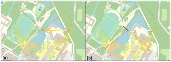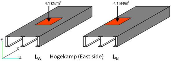 To characterize operational conditions, two static loading scenarios (Figure 9) are proposed. In the first loading scenario (), a uniformly distributed load (UDL) is applied at the centre of the mid-span of the bridge. In the second loading scenario (), the same UDL is applied at the side of the mid-span of the bridge. The UDL is set to 4.1 kN/m2. This is based on the characteristic value of UDL in the serviceability limit state (Equation (2)) according to Section 5.3.2.1 “Uniformly distributed load” of EN 1991-2:2003 [39].