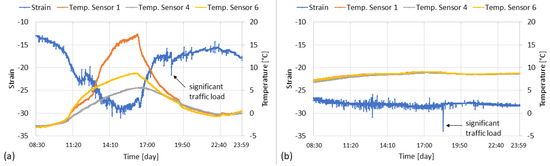 Strain and temperature measurements on (a) a sunny day and (b) a cloudy day.