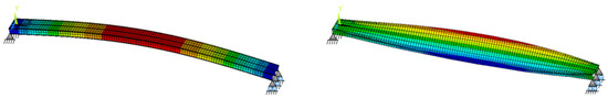 Dynamic model simulations are performed for different boundary conditions to obtain natural frequencies and mode shapes similar to the measured ones [38]. Significant changes in natural frequencies are observed at different combinations of boundary conditions. The models of the two mode shapes and respective natural frequencies are shown in Figure 8. Using the simply supported conditions and restraining only the top flange of the beams at each side yielded similar modal frequencies to the measured ones. The first two frequencies of the model are 2.47 Hz and 4.23 Hz, corresponding to the first vertical bending and torsional modes. According to Section 5.7, “Dynamic models of pedestrian loads” of Eurocode suggests that forces generated by pedestrians with a frequency matching one of the natural frequencies of the bridge can induce resonance and must be considered in limit state verifications [39]. The frequency 2.47 Hz can be matched by pedestrians crossing the bridge. This, however, has not been considered in the bridge design, which was almost 50 years ago.