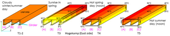 The UT Campus bridge has a unique position relative to the sun path and the abovementioned surroundings. Five different temperature distributions are proposed (see Figure 10). These scenarios are derived based on the monitoring data obtained from the SHM system and modified slightly to account for possible extreme future temperature scenarios. The first temperature distribution scenario, T1, represents a cloudy winter day with an ambient temperature of 0 °C. T2 is a hot, cloudy summer day with an ambient temperature of 30 °C. T3 is a linear temperature distribution along the length and depth of the bridge, where temperature drops from 8 to 20 °C. This scenario recreates the sunrise in spring/autumn. T4 is a linear temperature distribution along the width and depth of the bridge; the temperature ranges from 10 to 30 °C. This scenario recreates a hot spring/autumn day at noon. Lastly, T5 is the same as T4 but with a temperature range from 30 to 50 °C. The last scenario represents an extremely hot summer day at noon.