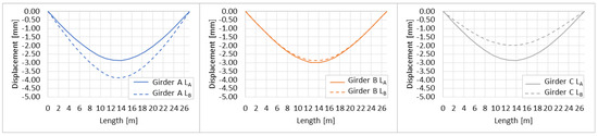 Bridge vertical deflections, which can be, for example, collected using computer vision-based systems [43] and image recognition techniques [44], are considered as the bridge response. The response of the girders at load scenarios, and , are given in Figure 11. In the first nominal traffic loading combination, resulted in largely equal deflection for all three girders, with Girder B having the largest deflections. However, resulted in different vertical displacements. The deflected shape of girder A increased. Girder B remained unchanged. Lastly, the deflected shape of the girder C decreased.