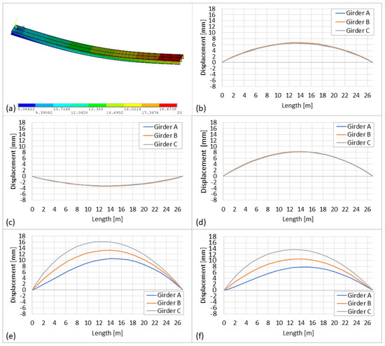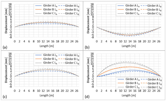 Figure 15 shows deflections of girders before and after the introduction of damage (). The bridge response for each loading combination is slightly different. At the reference temperature of 20 °C, the maximum vertical displacement in girders increases by 3–4%. Due to the nature of the damage (i.e., damage severity reduces from girder A to C), a decreasing pattern in deflections of girders A to C can be observed.