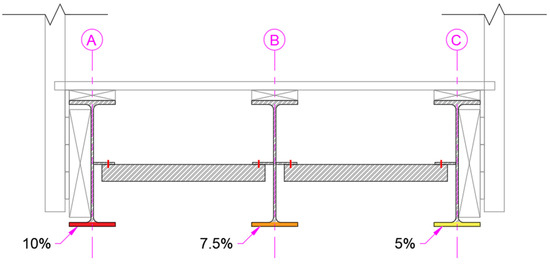 Damage (in the form of steel corrosion) is simulated to study the response of different static and temperature-induced loads. Figure 14 shows the damage severity. Damage is simulated as the reduction in Young’s modulus by 10%, 7.5%, and 5% of the bottom flanges of girders A, B, and C, respectively.