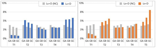 When both traffic and damage are applied, the vertical displacements at T1 and T3 decrease. The change in response at T1 is higher than at T3. At T2, the bridge response increases by a maximum of 5.21% for on girder A and 5.65% for on girder C. Although the temperature distribution is uniform at 30 °C, in , girder A experienced a higher increase in deformation of 5.21% than girder B (4.53%),and girder C (4.15%). In , girder A has a smaller increase of 4.62% compared to girder B (4.97%) and girder C (5.65%). At T4, the DAD results in both positive and negative responses due to and , but no significant changes can be observed. At T5, the DAD results in the highest change in bridge response, yielding a maximum of 5.85% for and 8.10% for .