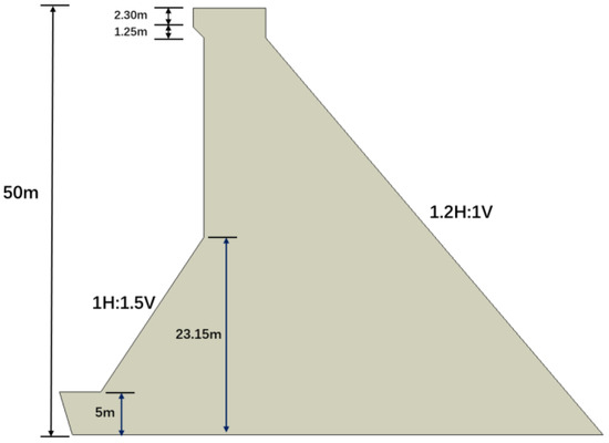 The case study presented in this paper is a project in the design phase. It is a concrete gravity dam with a curved axis, with a radius of 187 m. The profile was selected from the non-overflow section of the dam, and the geometric information was obtained from the design drawings. The maximum dam height is 50 m. The face of the dam body consists of a vertical and a 1H:1.5V slope, while the downstream face of the dam slope is 1.2H:1V. Specific geometric information is presented in Figure 1. The normal operating water level is 1288 m at elevation. In the calculation and analysis of this paper, the downstream water depth was assumed to be 10 m.