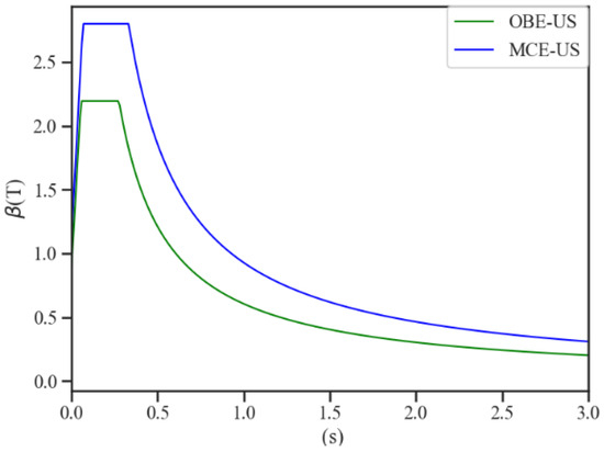 Operational Basis Earthquake (OBE) and Maximum Credible Earthquake (MCE) are determined by seismic safety evaluation, with peak ground acceleration (PGA) values of 0.253 g and 0.701 g, respectively. The United States Geological Survey provides an earthquake risk map within the United States (USGS, 2014), and because the site is located in a region where earthquakes occur frequently, it is analogous to an area of California in the United States where earthquakes are more hazardous. According to the seismic risk map, the corresponding acceleration response spectra , for periods of 0.2 s and 1.0 s with a 50-year overshooting probability of 10% (return period of 475 years) and a 50-year overshooting probability of 2% (return period of 2475 years) can be obtained, as shown in Table 4.