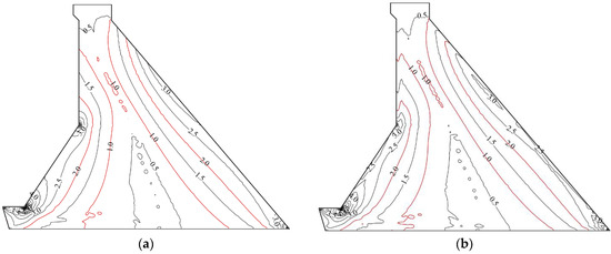 Minimum principal stress of the gravity dam body profile with different materials under MCE conditions (unit: MPa): (a) CVC dam; (b) RFC dam. Minimum values are marked in red.