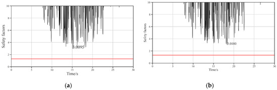 Time-history diagram of the safety factor of the foundation surface of the gravity dam under MCE conditions: (a) CVC dam; (b) RFC dam.