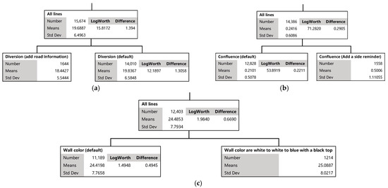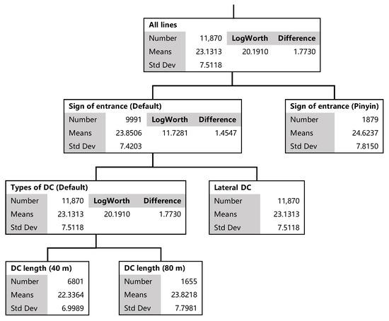 In the process of driving in the UI, in addition to the type, length, and position of the marking line, the setting of the marking line influences the driver’s safety and comfort [36,37]. To explore the influence of traffic safety settings, we investigated the important control conditions that have a good effect on traffic safety facilities. Firstly, a whole decision tree was built for ten schemes, and then the decision tree was grouped into different sections. The independent variables considered included the deceleration section type, deceleration section length, sign information, sign location, sign density, wall color, etc. Before the analysis, it was necessary to adopt multiple linear regression to model the independent and dependent variables to consider the influence of different factors on the experimental results. The methods involved are detailed below: