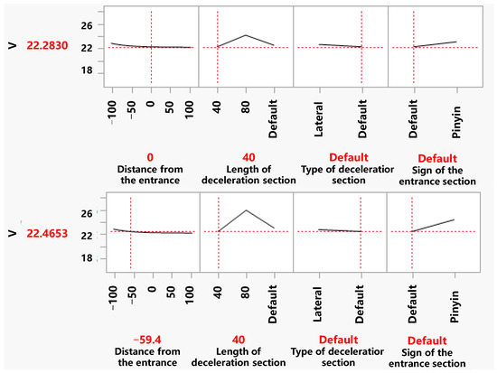 As can be seen, the average speed of the entry sign after the pinyin annotation was changed from 23.85 to 24.62, which does not indicate an excellent slowing effect. The change in the type and length of the deceleration section did not achieve a good effect. In addition, compared to the other influencing factors, the influence of the wall color on the speed of the entrance section was also not evident. However, it is still unclear whether the default length of the deceleration segment is better than reducing the deceleration segment length to 40 m. We further analyzed the influence of the deceleration section length, and the analysis results of the neural network are shown in Figure 5. After the relationship of the neural network was determined, the speed was analyzed by the predictive profiler. Its main function is to train the neural network model so that the model learns the speed data collected at a frequency of 20 Hz in the entrance segment, so that it can predict the speed trend in other cases in the future. It can be seen that the scheme that increases the length of the deceleration section had the maximum speed of 50 m after entering the UI entrance, indicating that the driver is more likely to drive at a faster speed than in the other schemes after a long deceleration section. At the entrance, the changes in the deceleration section type and entrance sign did not have a significant effect on speed, and the length of 40 m and the default 60 m deceleration section achieved a better deceleration effect than 80 m. Based on this, for the setting of the entrance section, it is recommended to maintain the default settings of the type of deceleration section and the entrance sign but to adjust the length of the deceleration section from 60 m to 40 m.