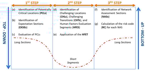 In the second step, the detailed analysis of the road is carried out and the Human Factors Evaluation Tool (HFET) is applied to the Human Factors Evaluation Segments (HFESs). The HFESs are segments composed of one or more challenging location (CHL) and their relative challenging transition (CHTs). The updated version of the HFET allows us to analyze at the same time all the CHLs belonging to the same HFES. The HFET is available together with the guidelines for its application in the Supplementary Materials of this paper (GUIDELINE for the application of the HUMAN FACTORS EVALUATION TOOL). The second step is divided into three main sub-steps: