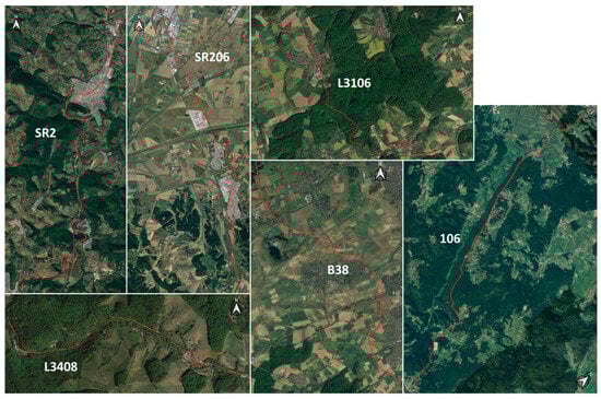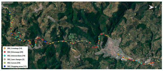 The steps to follow for the identification of PCLs and EXSEs are the same as defined in Paliotto et al. []. PCLs are any area where drivers must adapt their driving program by changing speed, braking, steering, or changing lanes. Normally, they are junctions, intersections, stops of public transport, exits, driveways, curves, carriageway width reductions, or pedestrian/cyclist crossings. PCLs are directly identified by driving through the road, considering the road database, looking at the design documents, or satellite images. An example of PCL identification is provided in Figure 2.