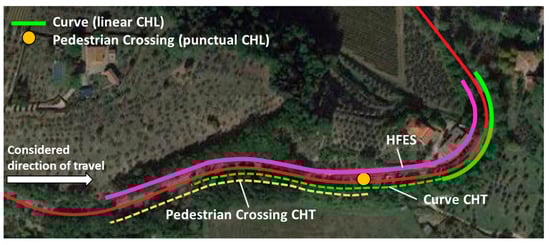 Once the CHLs have been identified, the area to evaluate with the HFET must be chosen. This area is the road stretch preceding and including the CHL, and it is called challenging transition (CHT). CHTs typically start 10–12 s before the CHLs and can include other elements of the road that are not CHLs or even other CHLs. If the latter is the case, the two overlapping CHTs (one for each CHL) must be merged, creating a single CHT. This final CHT is then called the Human Factors Evaluation Segment (HFES) because this is the segment that is evaluated with the HFET.